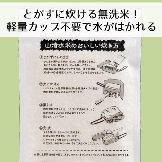 魚沼産コシヒカリ「山清水米」を無洗米にし、1合(150g)ずつ真空パックにしています。