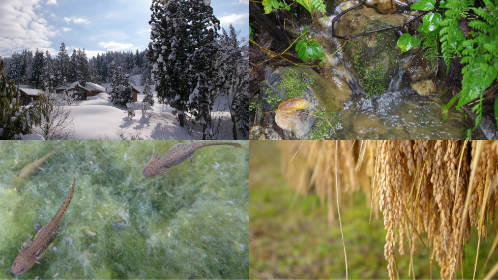 山清水米は、中山間地の山奥の棚田で作られています。冬には3メートル以上の雪がつもり、春になると雪解け水が大地にゆっくり浸透し、ミネラルをたっぷり含んで田んぼに注がれます。生活排水が混ざっていない、飲める水です。